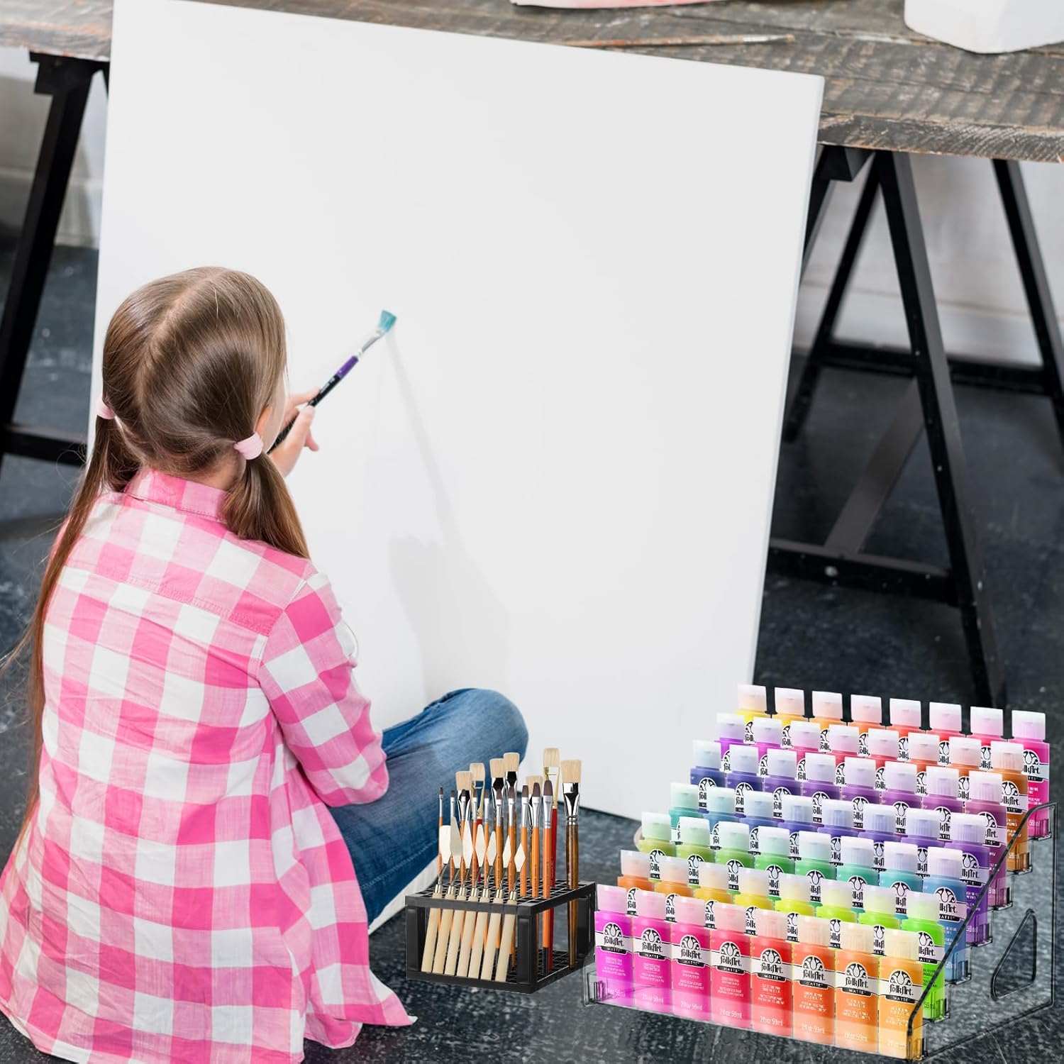 "Features: Keep your art supplies neat and within reach with this all-in-one tabletop paint organizer set! This organizer set keeps paints and brushes tidy with 2 PCS 7-tier clear paint bottle storage rack (holds 56 bottles) and 1 cube brush holder (fits 96 brushes). Clear, snap-together design offers easy visibility and quick setup. Perfect for model paints, makeup, or crafts—saves space while organizing your workspace effortlessly. Specifications: Material: Acrylic Color: Clear Size: Acrylic Paint Organizer: 11.7""D x 12.3""W x 7.2""H Brush Holder: 5.7""D x 5.7""W x 3.5""H Package includes: 2 x Large Capacity Miniature Paint Storage Rack 1 x Paint Brush Holder Notes: For manual measurement, please allow slight errors in size. The color may have a slight difference due to different screen displays."