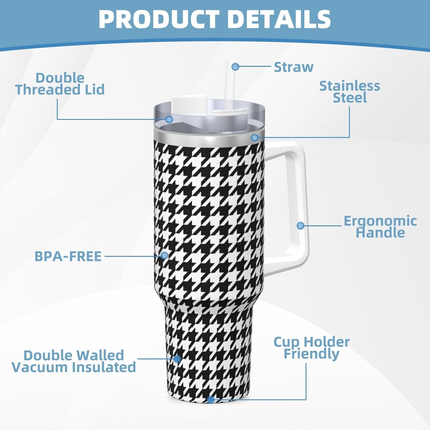 This Houndstooth Black Print Ice Bully Cup features a double layer stainless steel design that can be used for a long time without rusting. The lid has good sealing to prevent water from overflowing, and it is easy to unscrew for filling and cleaning. It can keep water, coffee, or drinks warm or cool for hours and is suitable for travel, camping, and driving.