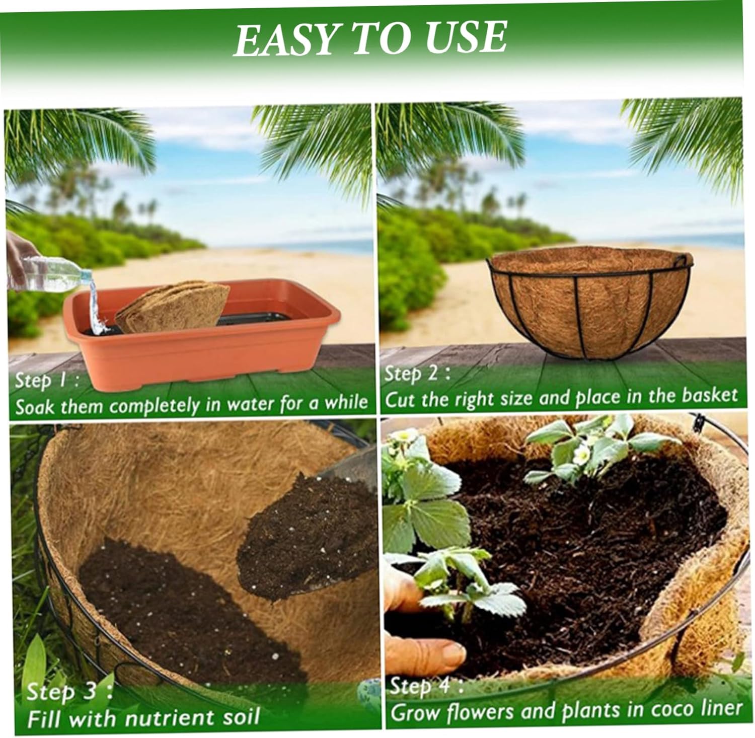 Description: The coconut coir liner is a natural and eco-friendly solution for enhancing plant growth. Made from quality coconut coir, it excellent breathability and biodegradability, creating an ideal environment for plants to. Each package contains six liners, providing great for gardening enthusiasts. With its generous size, the liner ample planting space and can be easily trimmed to fit different-sized flower pots. Using the coconut coir liner is a breeze - simply soak it in water, trim it to size, fill it with potting soil, and start planting. Its versatility makes it suitable for various outdoor planting scenarios, including gardens, balconies, and hanging baskets. The coconut coir liner not only serves a practical purpose but also adds a touch of rustic charm to any setting. Elevate your gardening experience with the coconut coir liner, providing a natural and sustainable solution for healthy and beautiful plants. Features:. Coconut Coir Liner. -Color: As Shown. -Material: Coconut Coir. -Size: about 20x40.5cm/7.87x15.94inch. Note: Manual measurement, please allow slight errors on size. The colors may exist slight difference due to different screens. Package Including 6 Pieces Coconut Coir Liners.