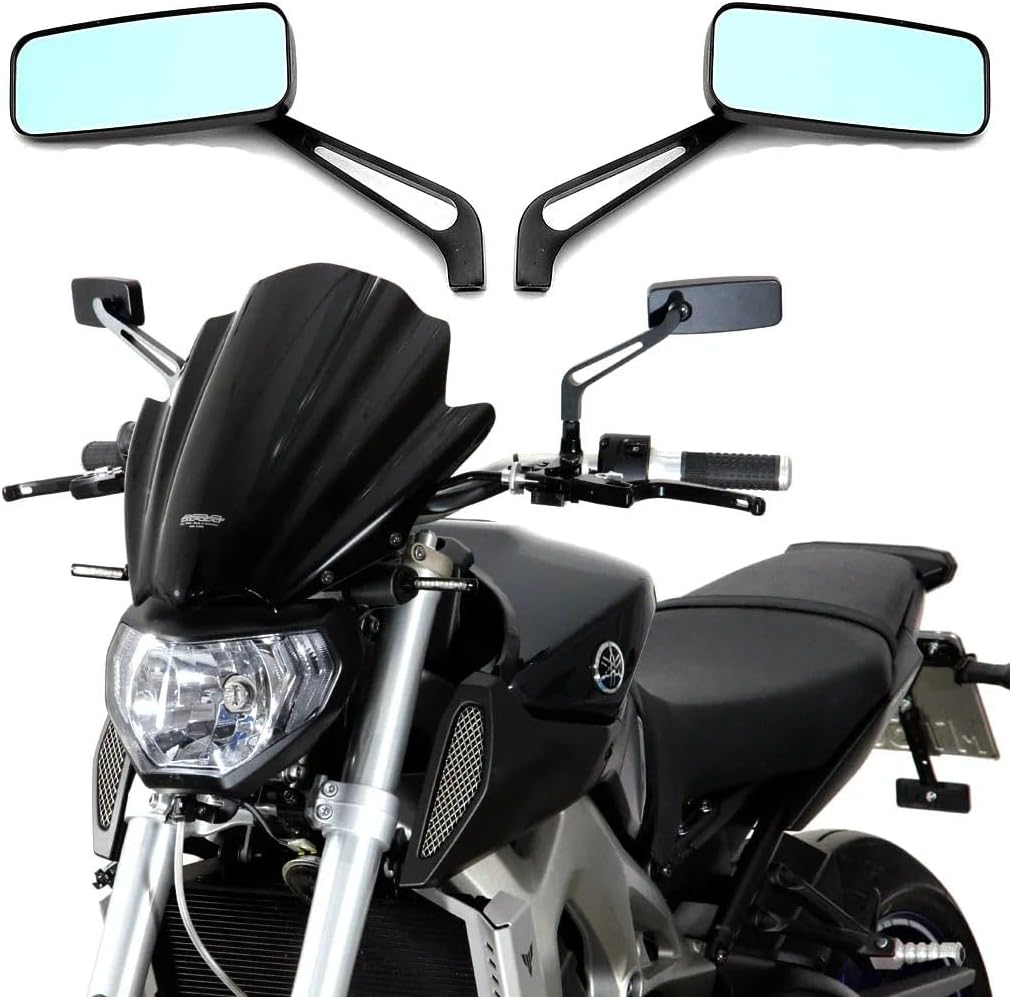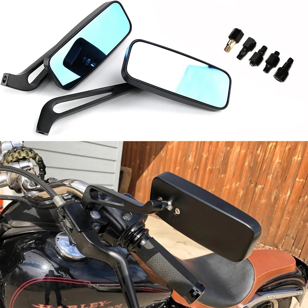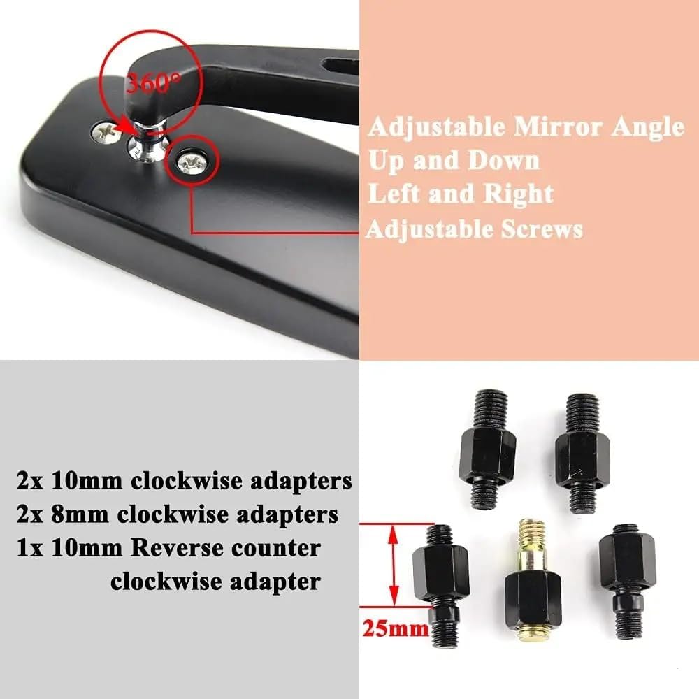 Item Type: Universal 8mm 10mm Rearview Mirror Condition: 100% new Quality: superior quality Quantity: 1 pair (left and right) Mirror: flat mirror Material: Aluminum Mirror Color: Blue Body Color: Black Bolt Thread Size: 8mm or 10mm( The package contains two sizes of screws, according to the screw holes of your motorcycle)Feature● Adjustable mirror angle, up and down, left and right (360 dergree adjustable).● Smoky blue mirror is with larger and clearer vision to let you see clearly and driving savely both at daytime and night.● Coated with UV blocking layer to avoid sun light and HID light reflect directly into driver eyes.Fitment●FIt any Motorcycle, Street Bikes, Chopper, Cruiser, Bobber etc.●Fit for all motorcycles or scooter or electric bike of standard 8mm / 10mm Mount.Package1 Pair Mirrors (Left & Right)2 pieces 10mm clockwise thread adapters2 pieces 8mm clockwise thread adapters1 pieces 10mm Reverse counter-clockwise adapter
