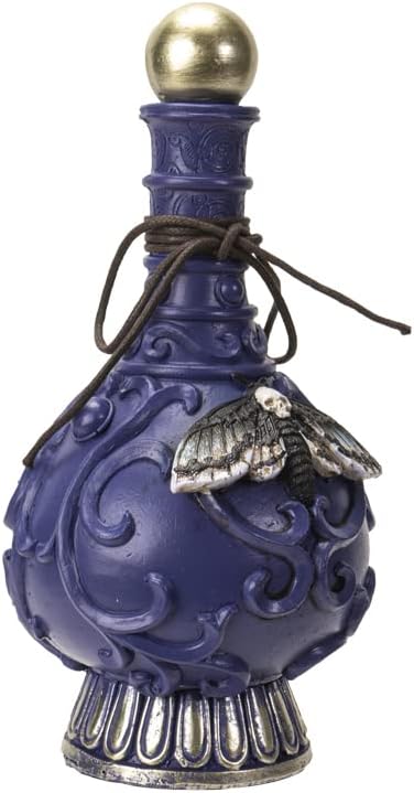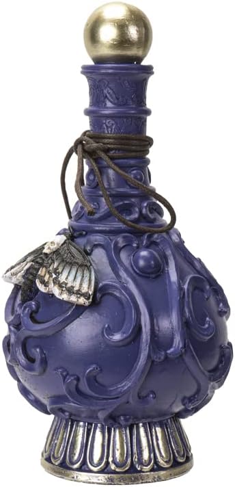 Transform your space with this enchanting 9-inch Gothic decorative potion bottle, a masterpiece of dark fantasy design. The bottle features a rich purple resin construction adorned with intricate raised scroll patterns that catch the light beautifully. Topped with an elegant gold-toned spherical cap, this piece exudes vintage charm and mystical allure. The bottle's most striking feature is its detailed wing and skull accent, creating a haunting yet sophisticated focal point. Dark cording wrapped around the neck adds an authentic ancient aesthetic. Perfect as a standalone statement piece or as part of a larger Gothic collection, this decorative bottle brings dramatic flair to any room. Its substantial size and detailed craftsmanship make it an impressive addition to bookshelves, mantels, or curio cabinets. The combination of deep purple coloring, metallic accents, and macabre details creates a compelling piece that captures the essence of Gothic home decor.