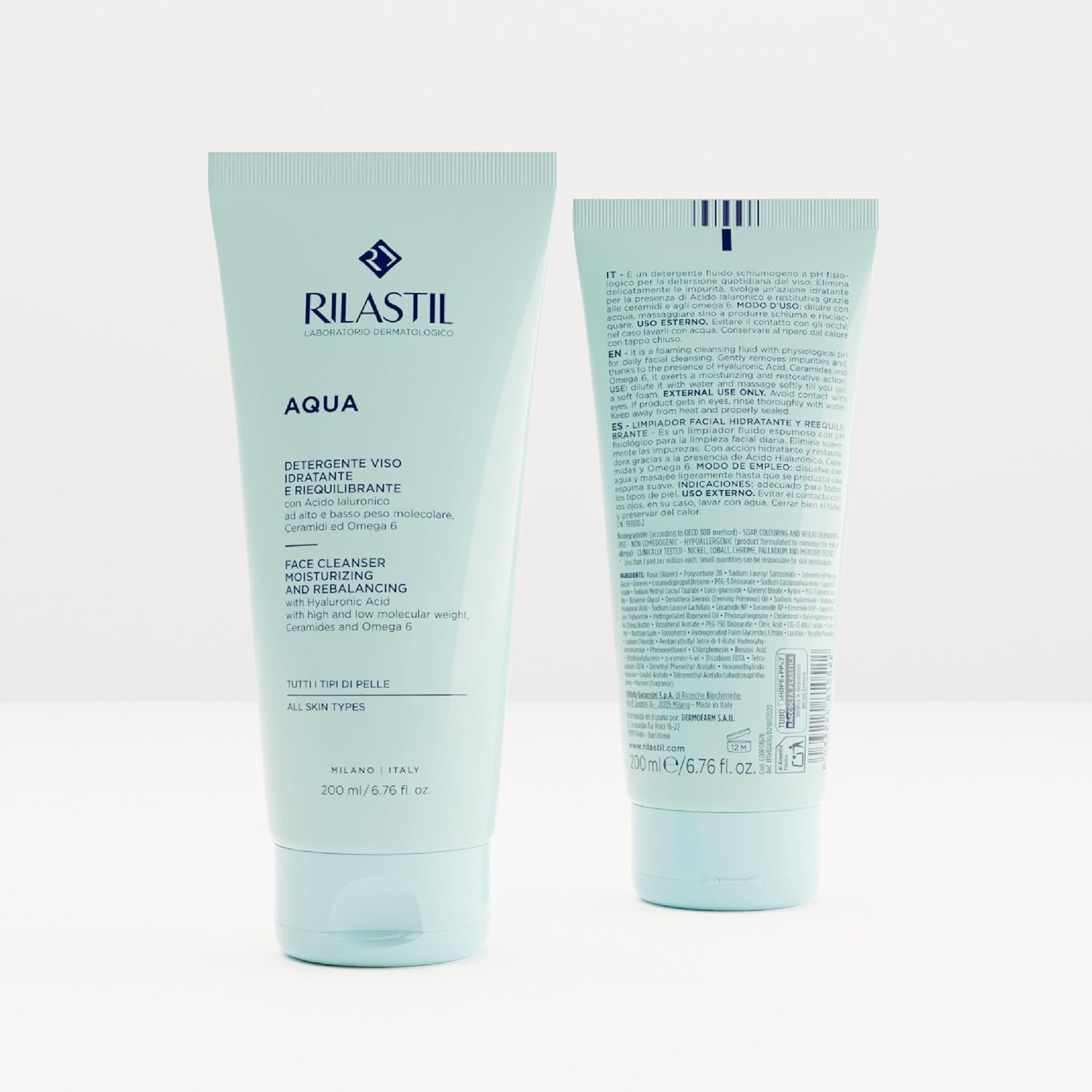 Rilastil Aqua Face cleanser Detergent at physiological pH fluid for daily facial cleansing. Gently free the skin of impurities, it restores proper moisture barrier of the skin, giving immediate hydration and softness. RESULT Skin cleansed and hydrated in depth. FEATURES Restores the proper state of hydration of the epidermis (Hyaluronic acid with high molecular weight for the surface hydration and low molecular weight for deep hydration) Restores the integrity of the skin barrier, preventing water loss (SK-Influx V) Gives brightness and softness to the skin (Evening Primrose Oil with Omega 6) HOW TO USE Gently massage a small amount of product on the palm of manoe dilute with water to produce a soft foam. Apply to the already damp skin and rinse. INDICATIONS Suitable for all skin types. PLUS dermatologically tested microbiologically tested Tested for Nickel, Cobalt, Chromium, Palladio and Mercury * clinically tested Secure Pack non-comedogenic No SLES and SLS without soap Without dyes without Parabens hypoallergenic ** * Each less than one part per million. Small amounts may be responsible for skin sensitization. ** Product formulated to minimize the risk of allergy. Available in 200 ml pack.