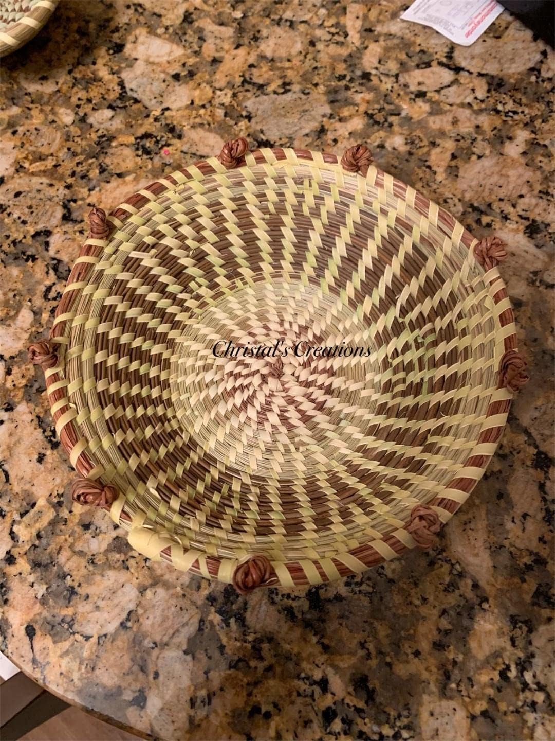 The Sweetgrass Bowl Basket with the Pine Knots is made with sweetgrass, pine needles, and bullrush. This basket is great to use in your office at work or at home. You can put sea shells, candy, rose petals, or other accessories in it. This basket is a great gift for a housewarming, a wedding, or a new job. This basket's measurement is the following: Top: Width= 6-7 inches, Height = 2- 3 inches Base of basket= 3- 4 inches wide Please email me if you have any questions before you purchase. This basket is made to order. Therefore, it can take 10 to 17 days to complete this basket.