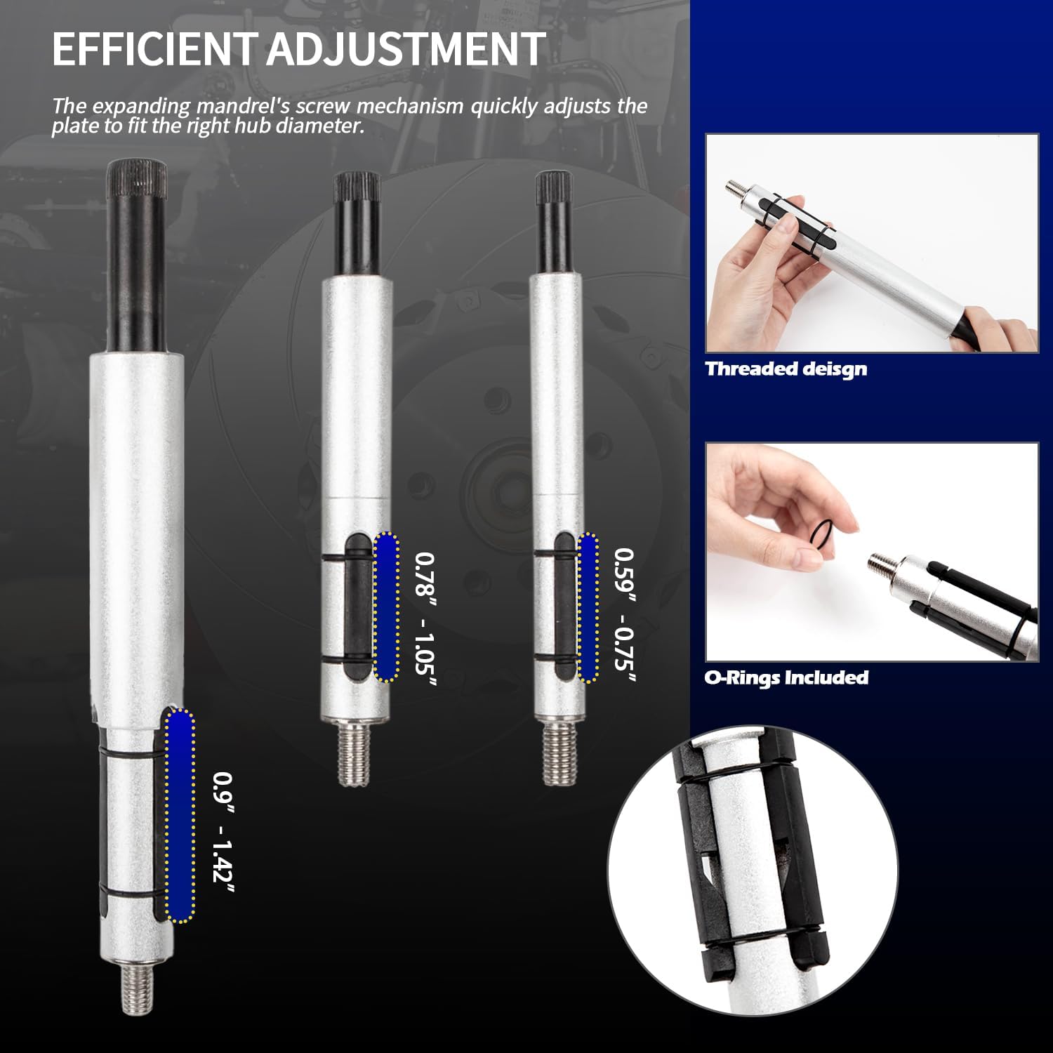 • Universal Compatibility: Features 3 expanding mandrel spindles (0.59-0.75", 0.78-1.05", 0.9-1.42" ranges) and 8 precision adapters(0.63",0.59",0.55",0.47",0.79",0.75",0.71",0.37";16,15,14,12,20,19,18,17mm) to fit virtually all clutch hub diameters with perfect alignment. Suitable for various vehicles and some light commercial vehicles.